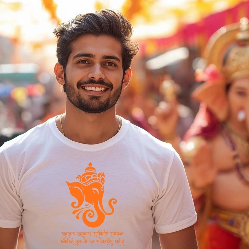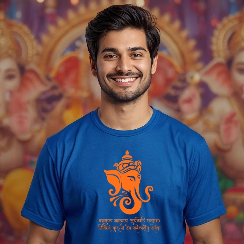 Ganesh 20, White, Blue and White available , Vakratund, Unisex ( Ladies and Gents) T- Shirt . 100% cotton, 180GSM, Round Neck, Half Sleeves.