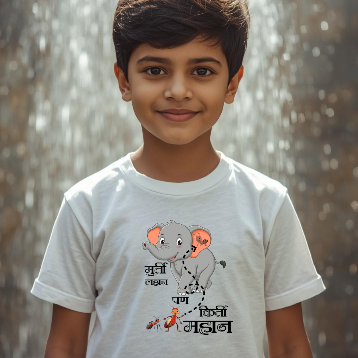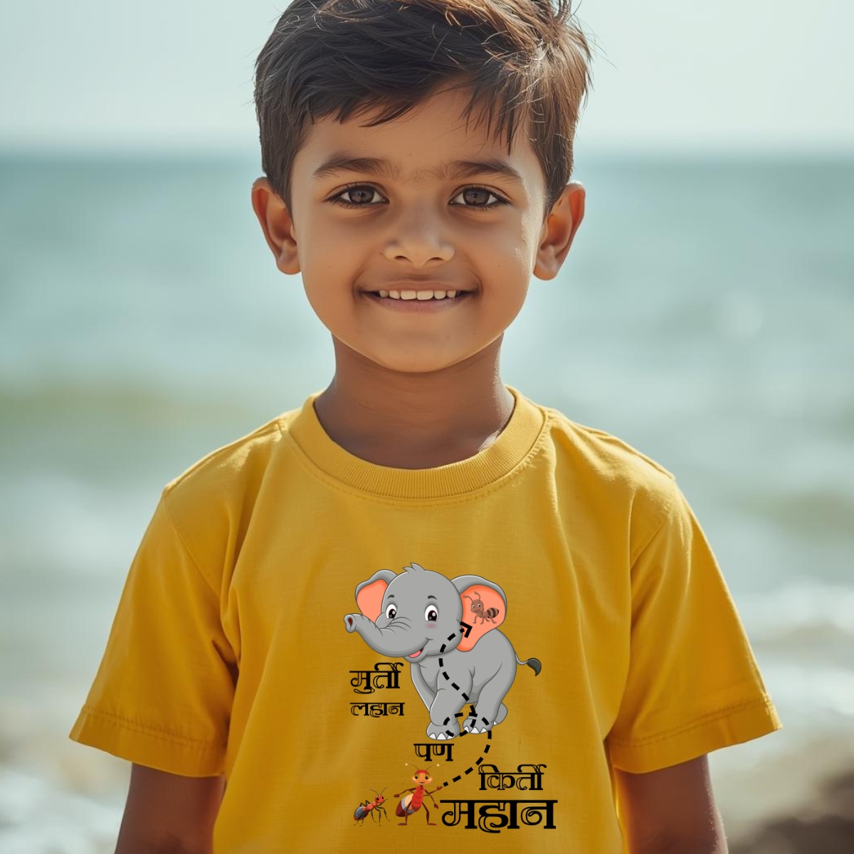 Kids 9 , White and Yellow also available , “Murati lahan pan kirti mahan” Unisex (kids) T- Shirt . 100% cotton, 180GSM, Round Neck, Half Sleeves.