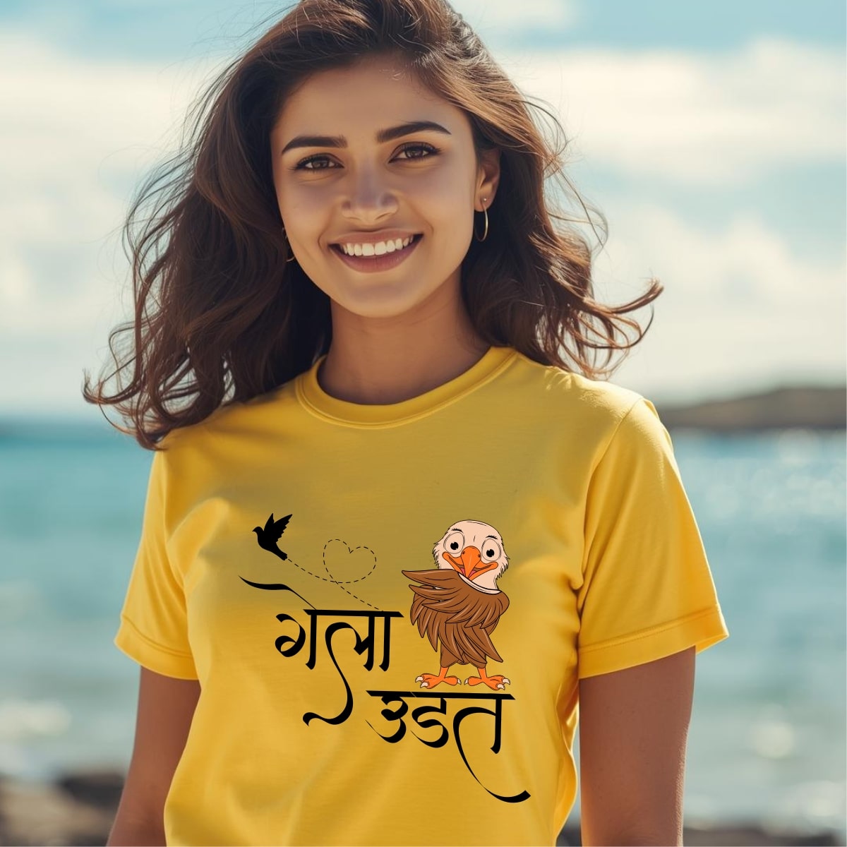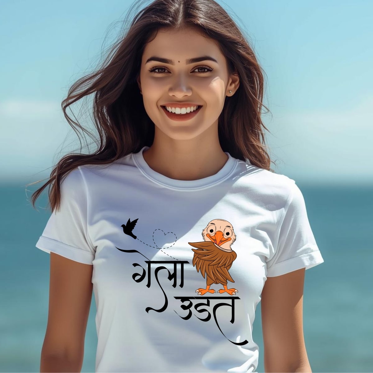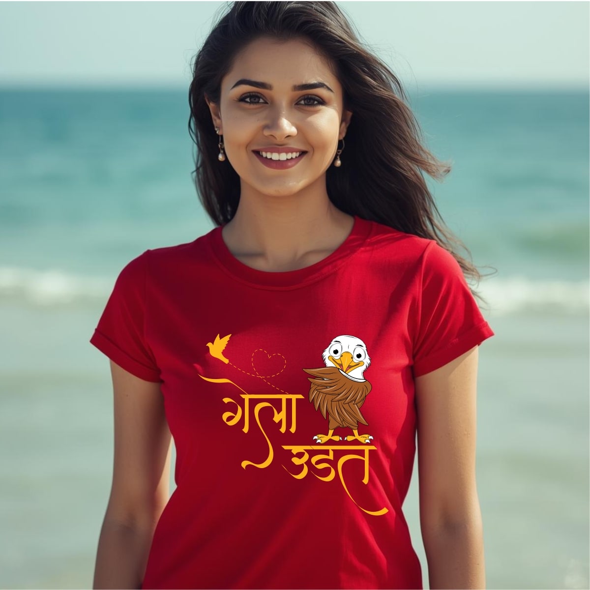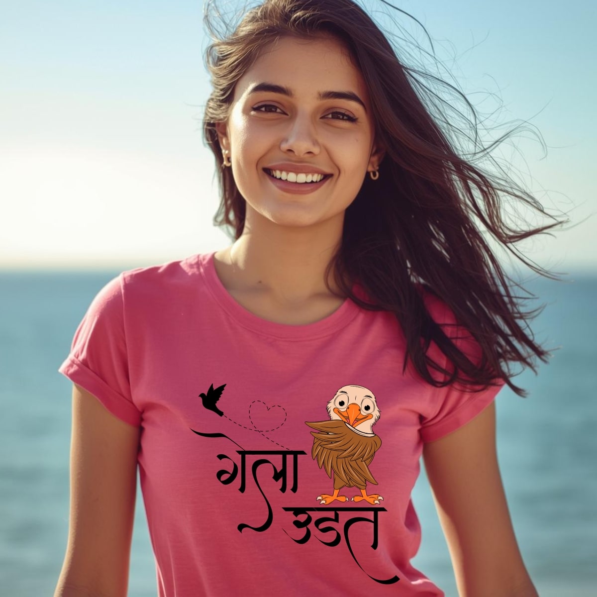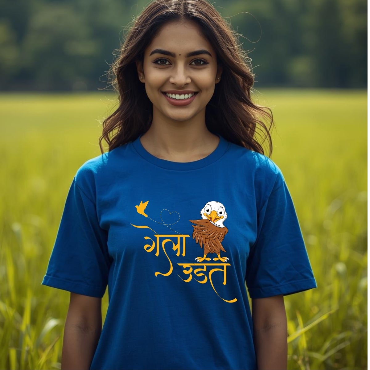 Marathi 31 (Women’s) , Black, Blue, pink, white ,Yellow and Red also available , “Gela Udat” Unisex (Women’s) T- Shirt . 100% cotton, 180GSM, Round Neck, Half Sleeves.
