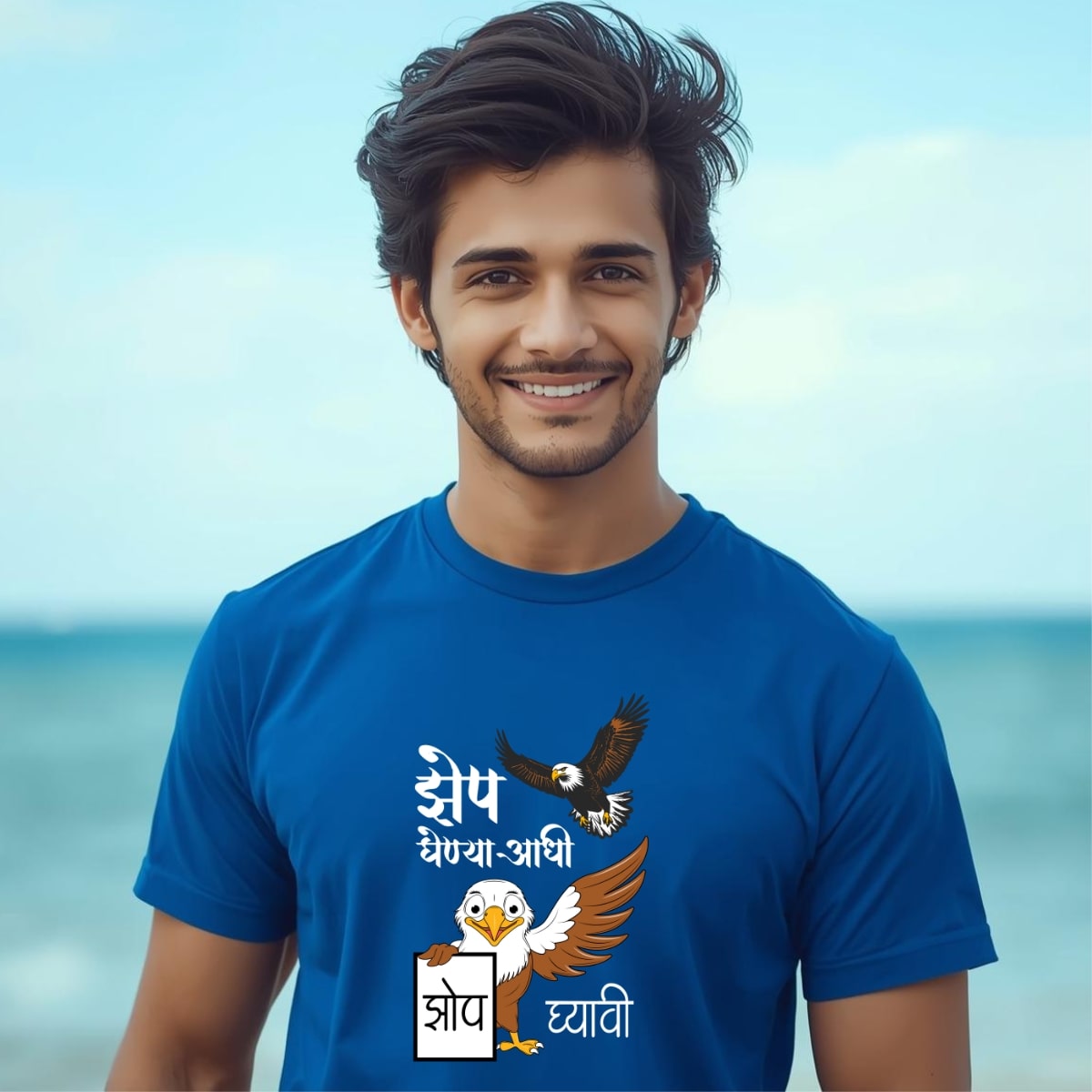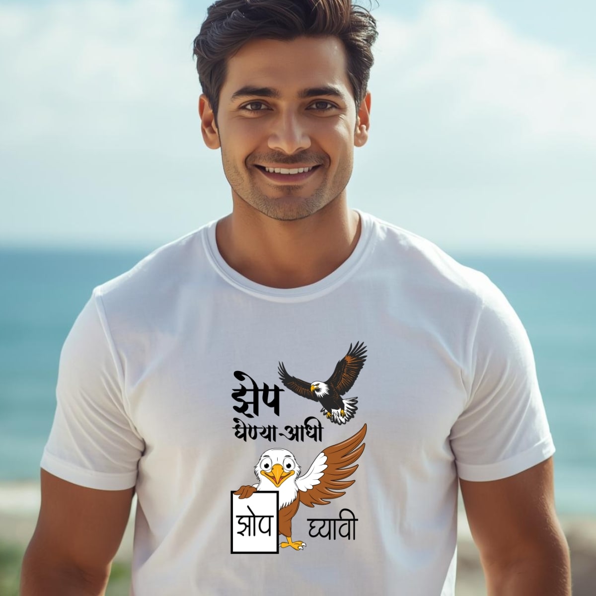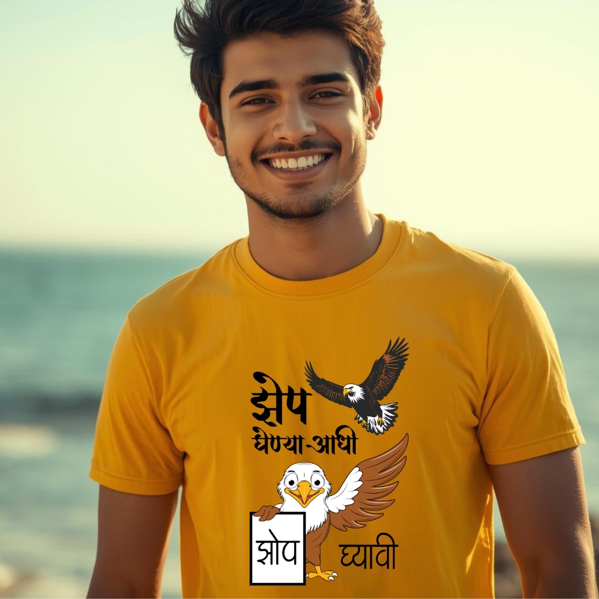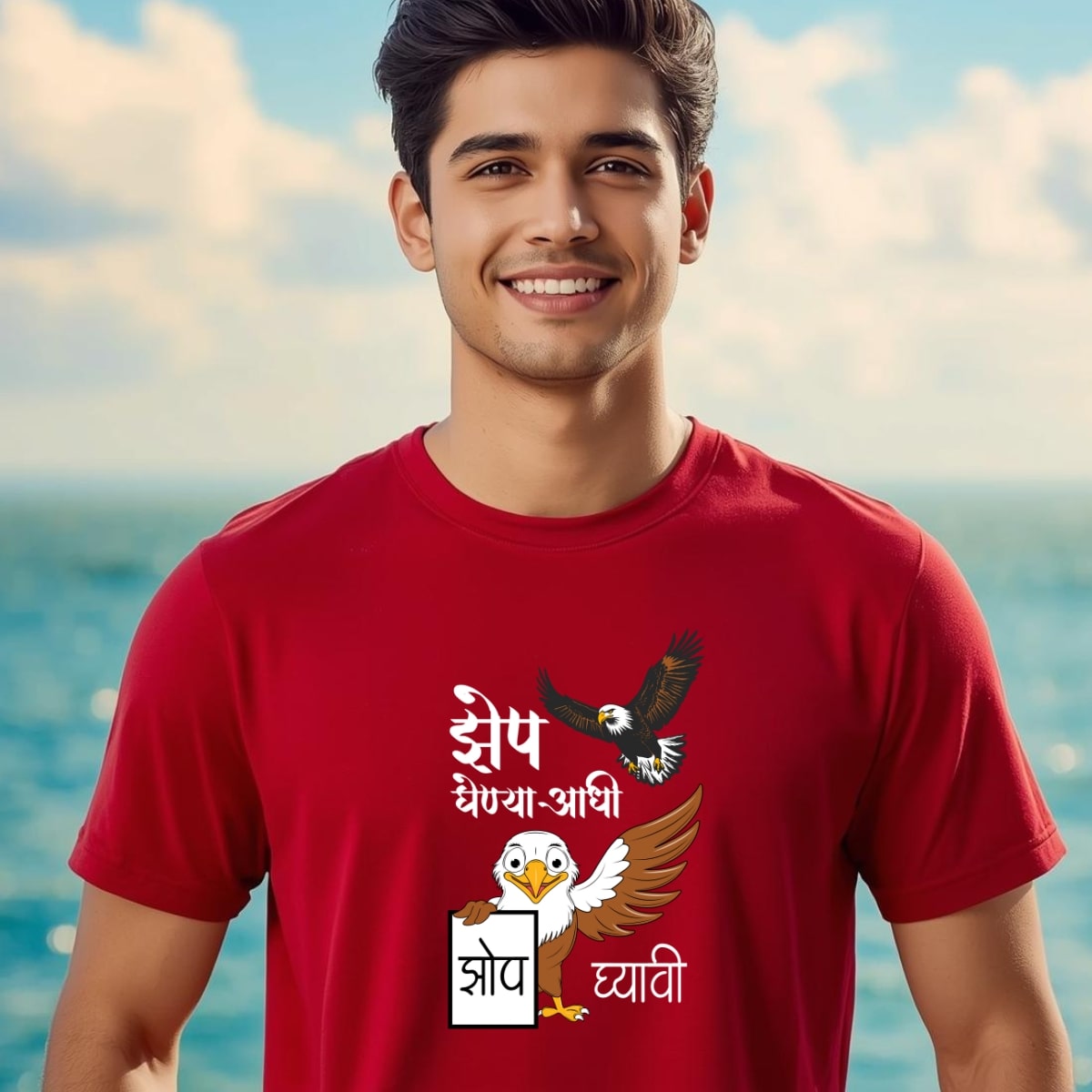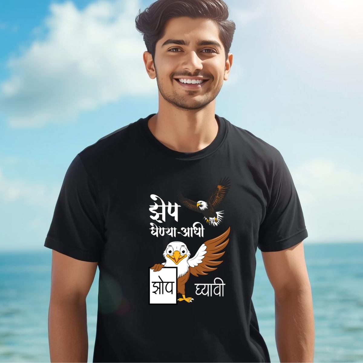 Marathi 33 Men’s , White, Black, Red, Blue, and Yellow also available , “Zep ghenya aadhi Zop gyavi” Unisex (Men’s) T- Shirt . 100% cotton, 180GSM, Round Neck, Half Sleeves.