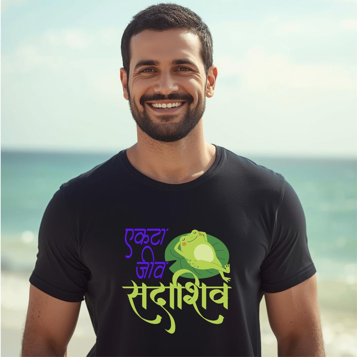 Marathi 6 Men’s , BlackĀ  available , “Ekata Jiv Sadashiv” Unisex (Men’s) T- Shirt . 100% cotton, 180GSM, Round Neck, Half Sleeves.
